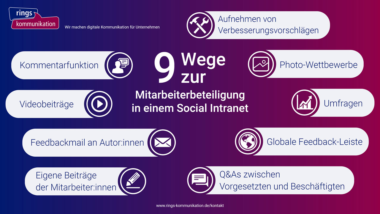 Um zu verhindern, dass die Beschäftigten an eine solche psychologische Barriere stoßen, ist es wichtig, die Mitarbeiter:innen bei der Einführung von Social Media Funktionen im Intranet zu begleiten und aufzuklären. Es ist wichtig weiterzugeben, dass die Mitarbeiteranliegen unternehmensrelevant sind, eine Einzelmeinung kann sich schnell als die Meinung vieler Kolleg:innen entpuppen, aus diesem Grund ist jede sachdienliche Meinung ernst zunehmen.