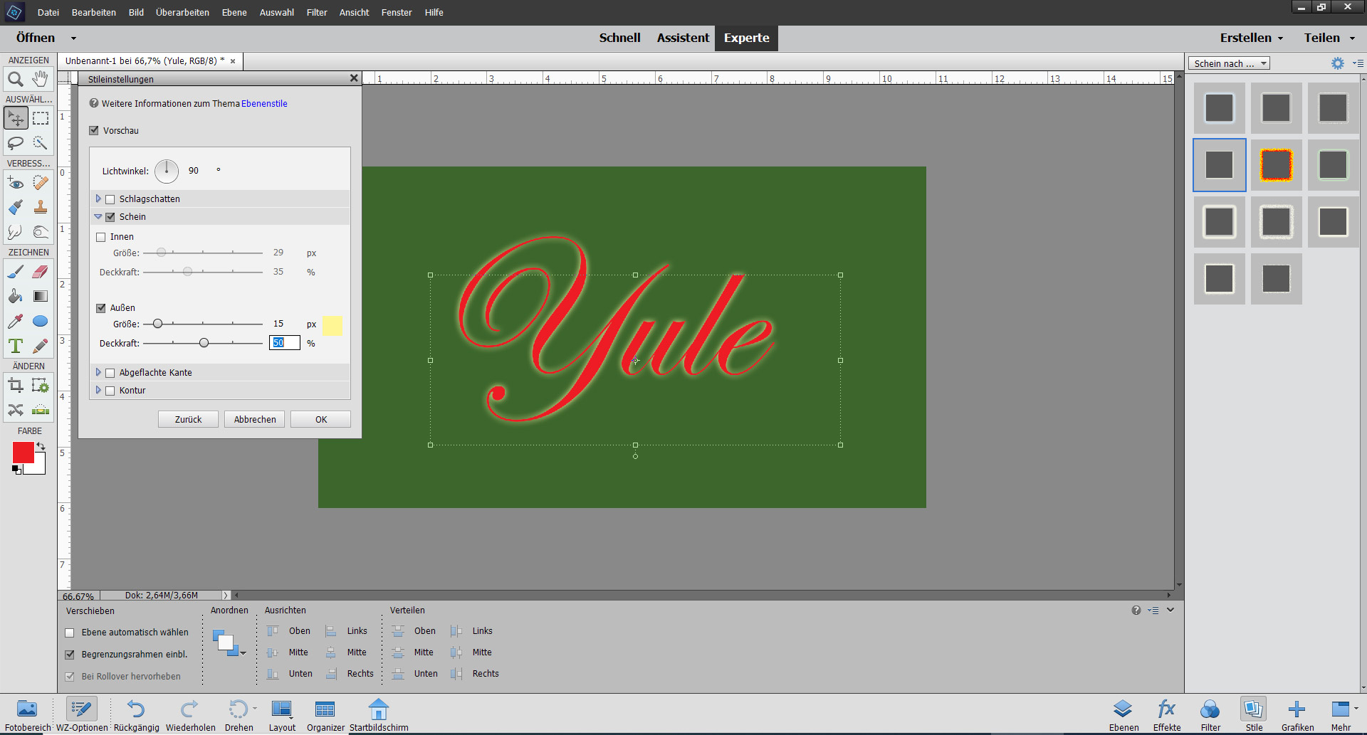 - „Ebene“ oben im Reiter anklicken > „Ebenstil“ > „Stileinstellung“ (der Editor bietet auch eine Reihe voreigenstellter Glow-Effekte an, die sich weiterbearbeiten lassen: Text-Ebene auswählen > unten im Reiter „Stile“ anklicken > „Schein nach außen auswählen“> Voreinstellung: z.B. „Einfach“ auswählen)